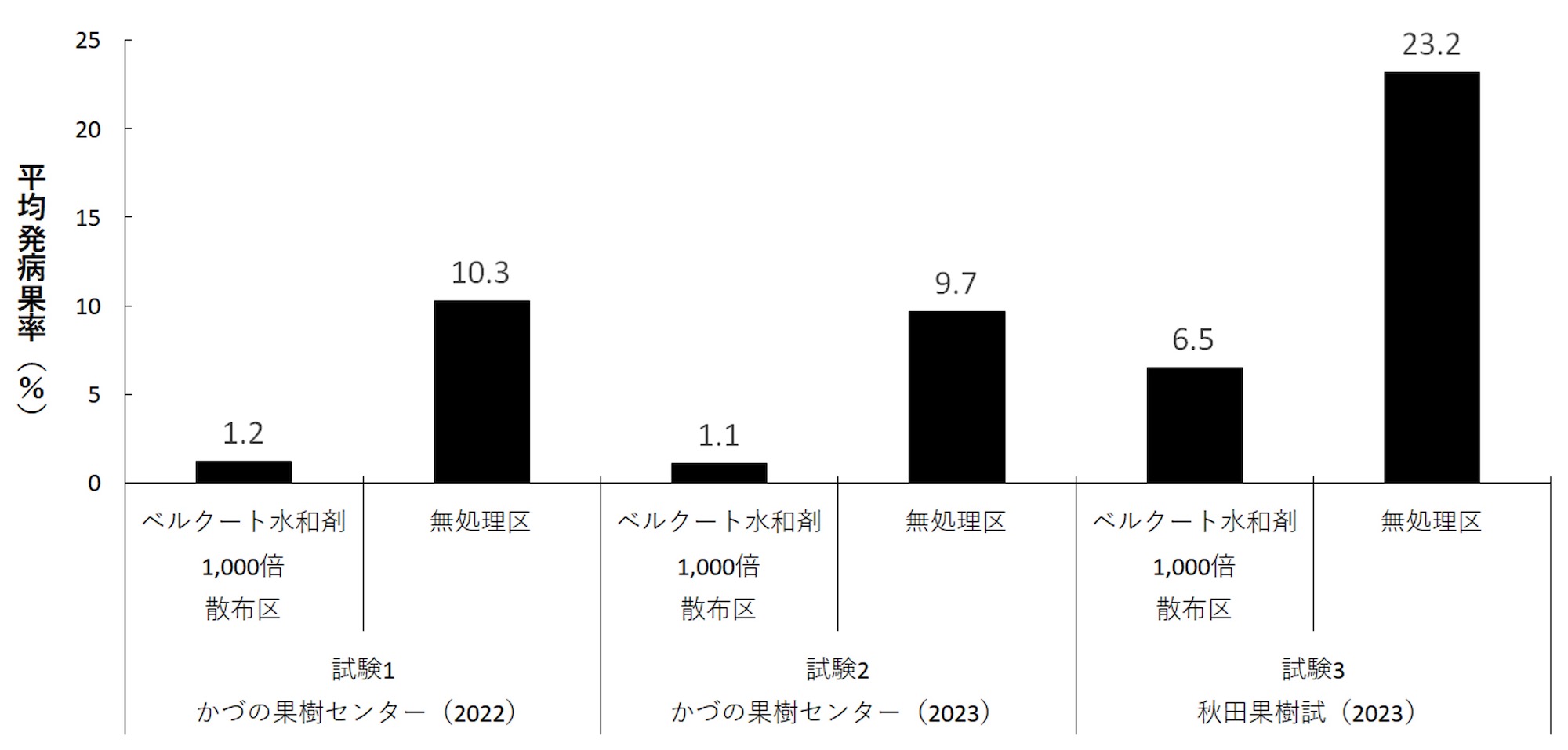 2024年12月に本病に対する初めての農薬登録がベルクート水和剤1,000倍に適用された。防除適期は9月中旬頃と考えられ、本剤を1回散布すると被害果の発生量を低減できる(図2)。