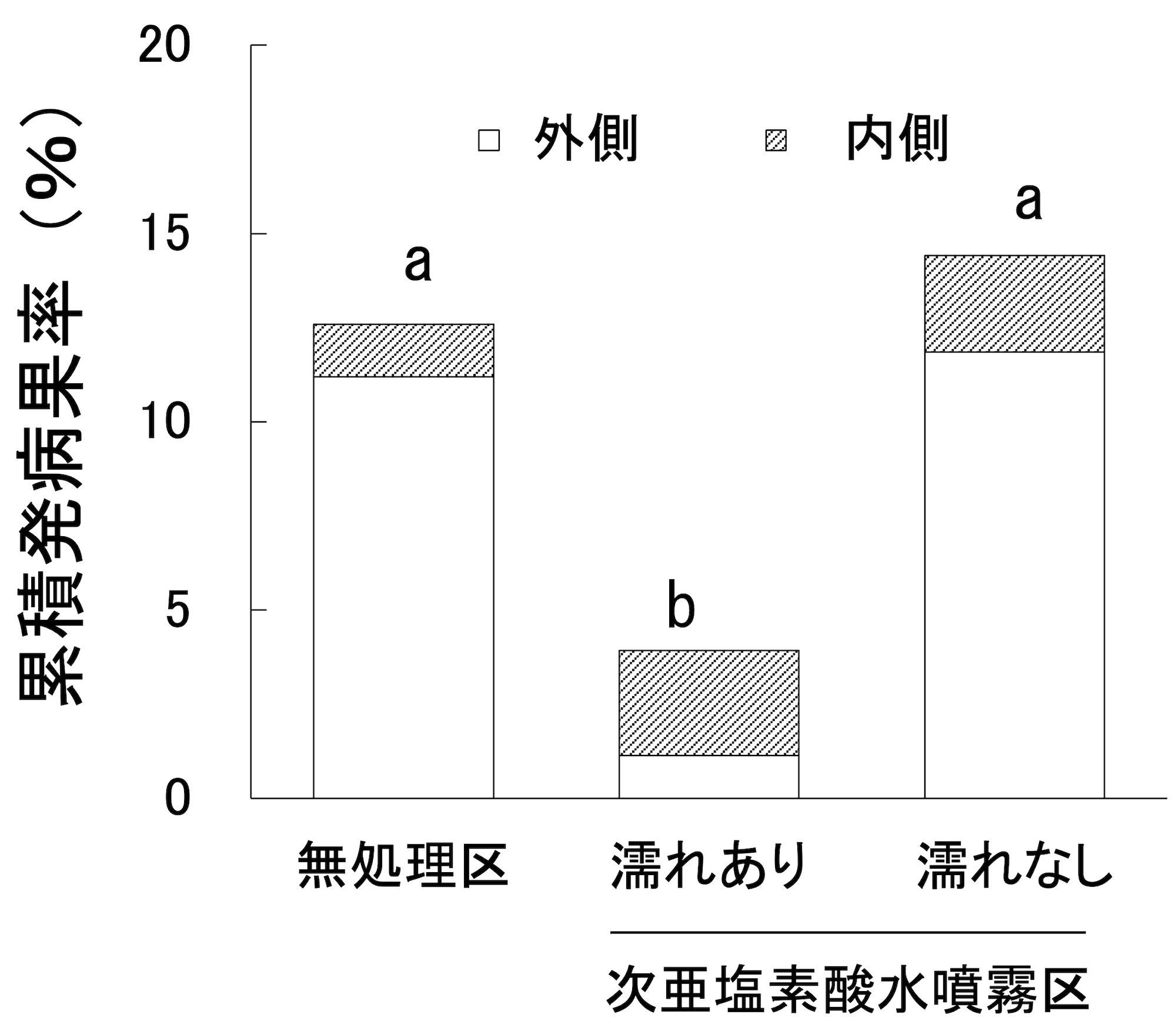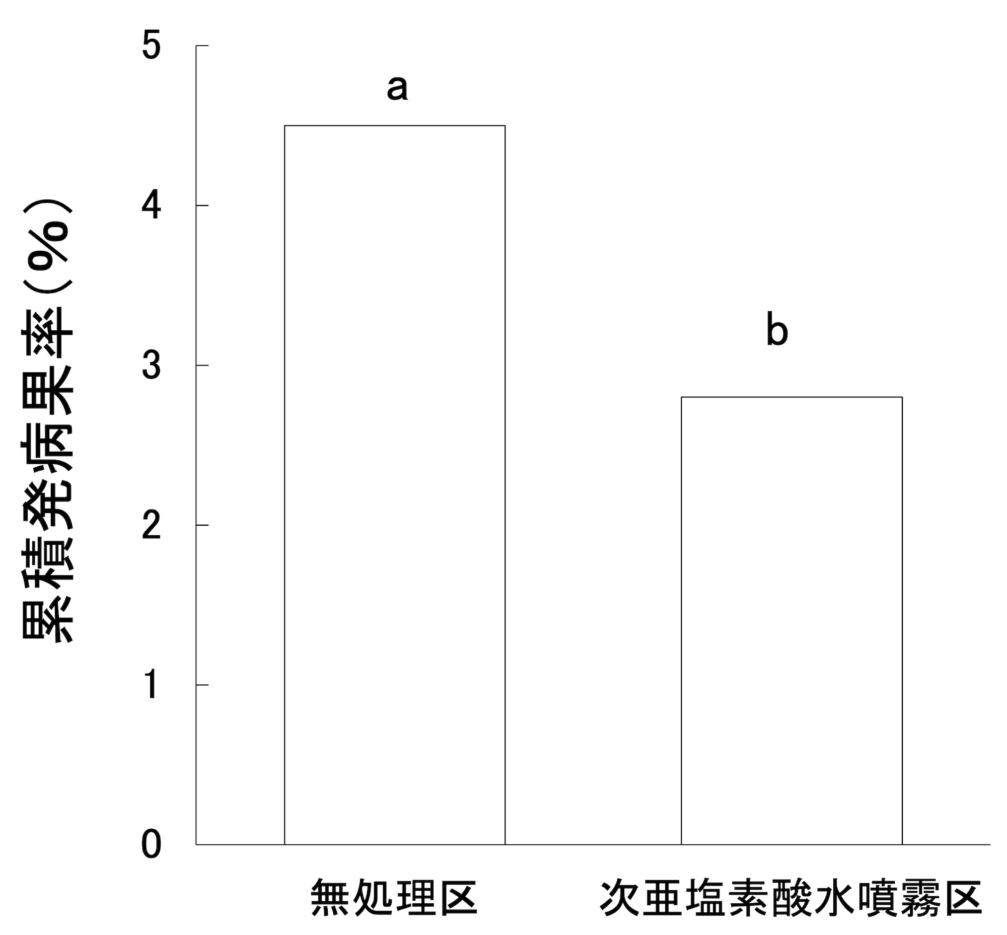電解水は、有効成分である次亜塩素酸が有機物と反応したり紫外線にさらされたりするとすぐに分解されるので、残留性が低く残効性はほとんどない。これは安全性の観点からはメリットであるが、持続性の観点からはデメリットであり、効果を維持するためには頻繁な散布が必要である。そこで電解水を持続的かつ省力的に効かせるための技術として高圧ミスト装置(動画)を利用する。この装置は以前からイチゴ等の施設栽培の高温対策として冷却用の水散布機器として導入されている。実際に、著者らが実施した試験(図2)では、高圧ミスト装置を用いた電解水の噴霧によって灰色かび病の発生を抑制することができた(8)。