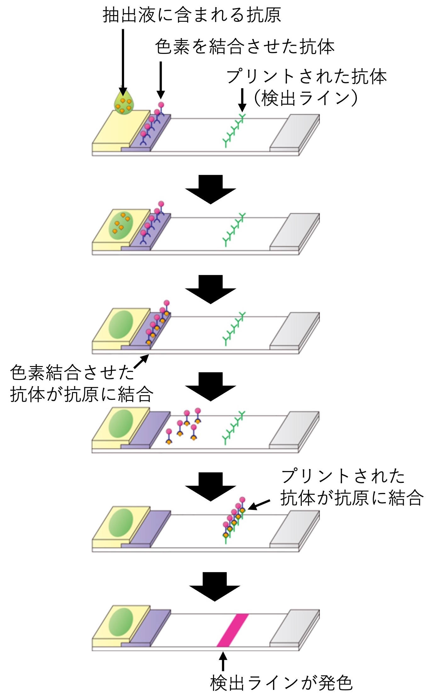 イムノクロマト法の原理を図1に示す(1)。ストリップは、判定したい病原体(抗原)に対して作った抗体が2カ所に配置されている。1カ所目はストリップの抽出液に浸す端付近のパッドの中に色素を結合させた抗体が含まれており、2カ所目はストリップの途中に線状にプリントされている(検出ライン)。試験紙の端を病原体(抗原)に感染している検体をつぶしてつくった抽出液に浸すと、液が吸い上げられるときに抗原も一緒に吸い上げられ、最初にパッドの中で色素の付いた抗体と結合する。色素の付いた抗体と結合した抗原はさらに吸い上げられ、検出ラインに達すると、ライン上にプリントされた抗体と再び結合しそこに止まる。このとき、抗原に結合している色素は狭いライン上に凝集するため、色素のラインが肉眼で見えるようになる(1)。抽出液中に標的の抗原がない場合はこの反応は起こらない。なお、検出ラインより上にコントロールライン(標的となる抗原の有無に関わらず現れるライン)がある製品が一般的なため、1本のみ線が現れた場合は陰性、2本の線が現れた場合は陽性と判断することになる(2)。