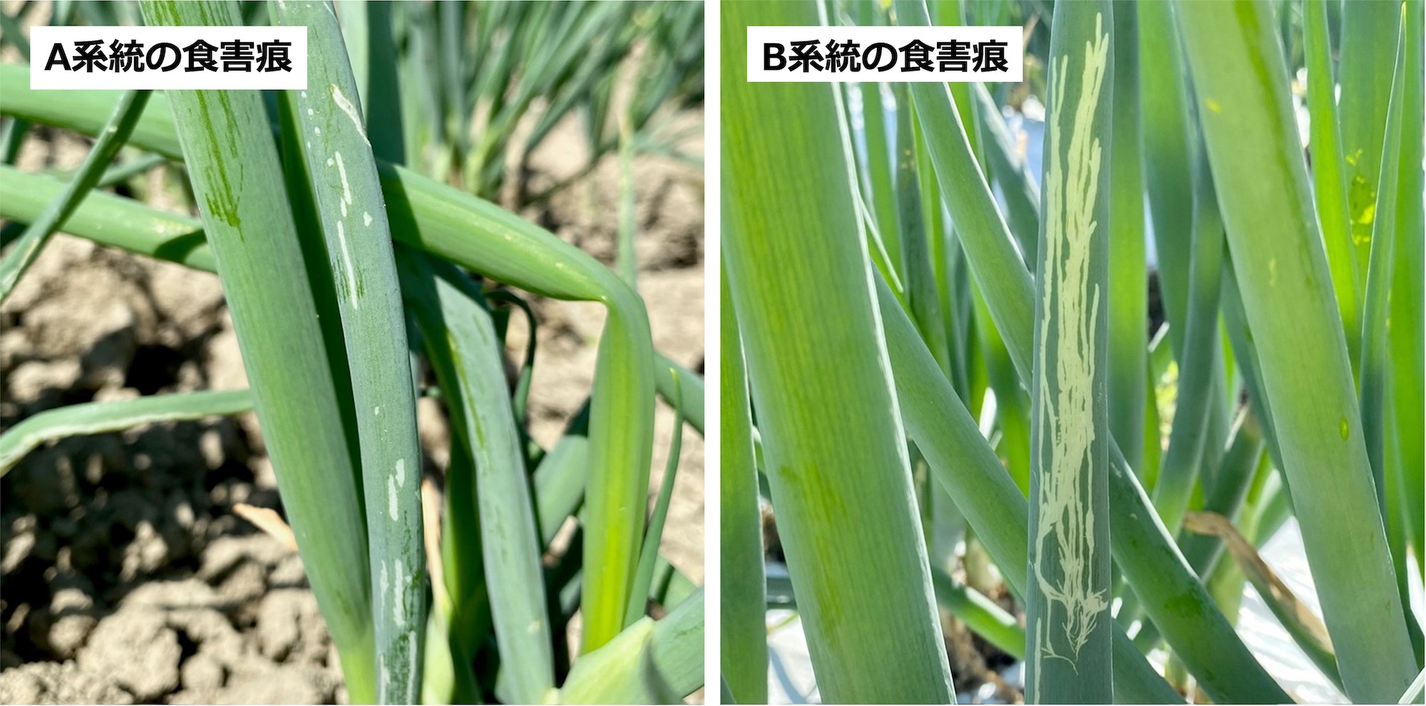 症状が変化したのは、従来と異なるタイプのハモグリバエが発生したためではないかと疑われた。そこで、ネギほ場から採取した成虫の遺伝子解析をおこなったところ、両者は遺伝子型が異なることが分かり、従来のハモグリバエをバイオタイプA(以下、A系統と略記)、新たに発生が確認されたハモグリバエをバイオタイプB(以下、B系統と略記)とした(3)。本稿ではA系統とB系統の発生現場での見分け方、生態学的な違い、防除対策について紹介する。