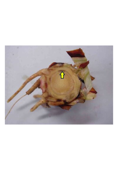 中:ロックウール栽培で発生したトマト根腐萎凋病の様子。