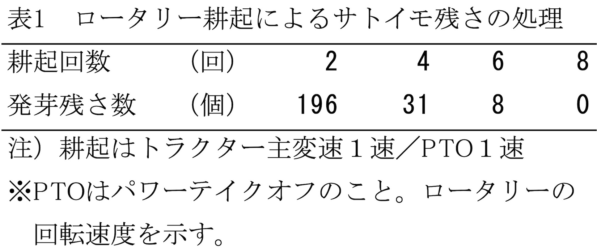 表1はロータリー耕起回数とサトイモの発芽数を示したものである。耕起の回数が増えるごとに、発芽するイモの数が減っていることから、ロータリー耕起による残さ破砕効果がよくわかる。しかし、ロータリー耕起を8回実施してようやく発芽するイモが無くなっていることから、しっかりと残さを分解するためには、耕起の回数はできるだけ多い方がよい。