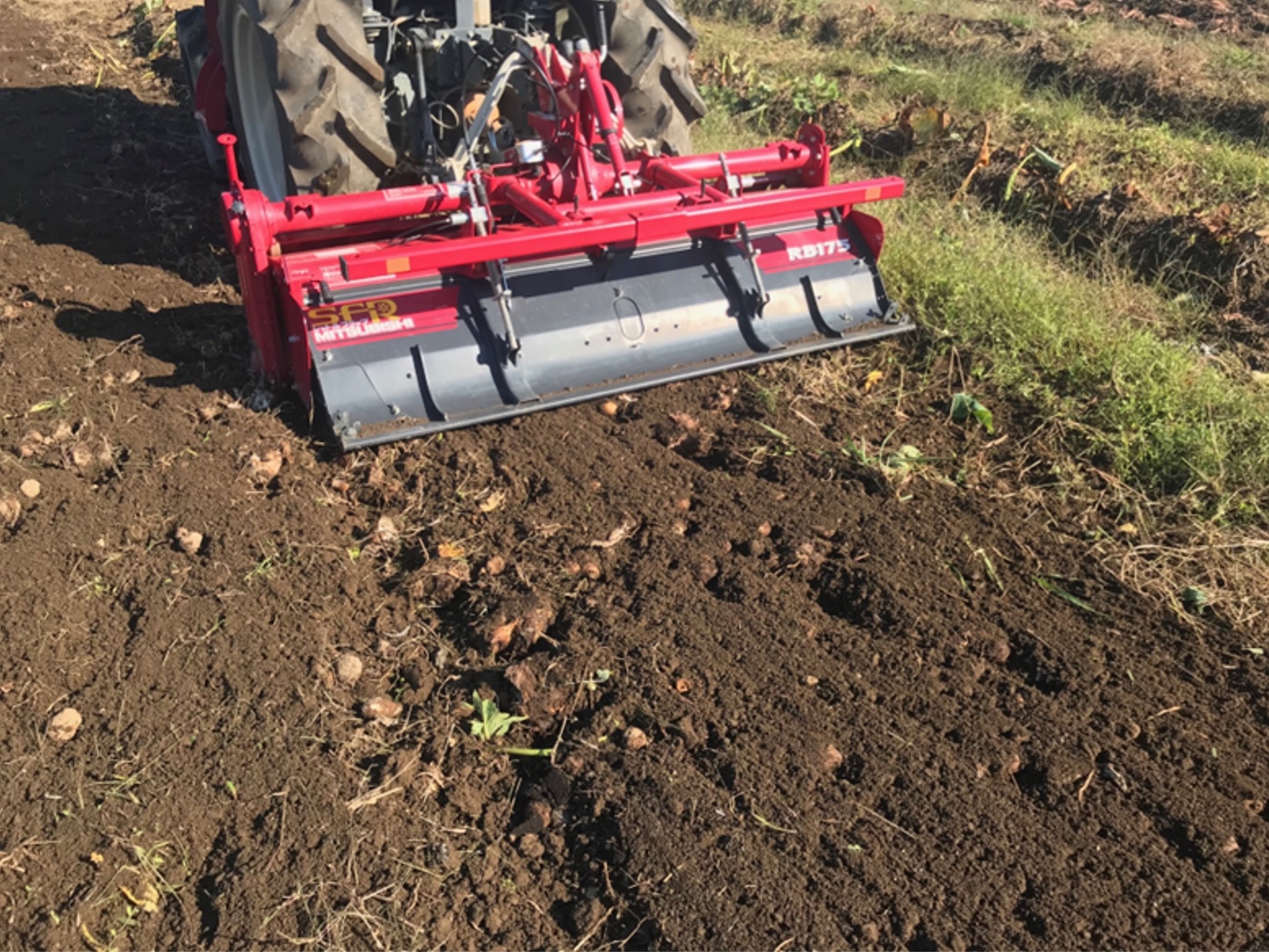 一般的な残さの分解方法は、ロータリー耕起など機械を用いた物理的な破砕である。破砕しやすい茎葉だけの残さは、この方法で十分破砕できる。一方、太い茎や根、芋などは耕起だけでは破砕できない。図2は、サトイモを株ごと耕起しているものであるが、芋がしっかり残っている。
