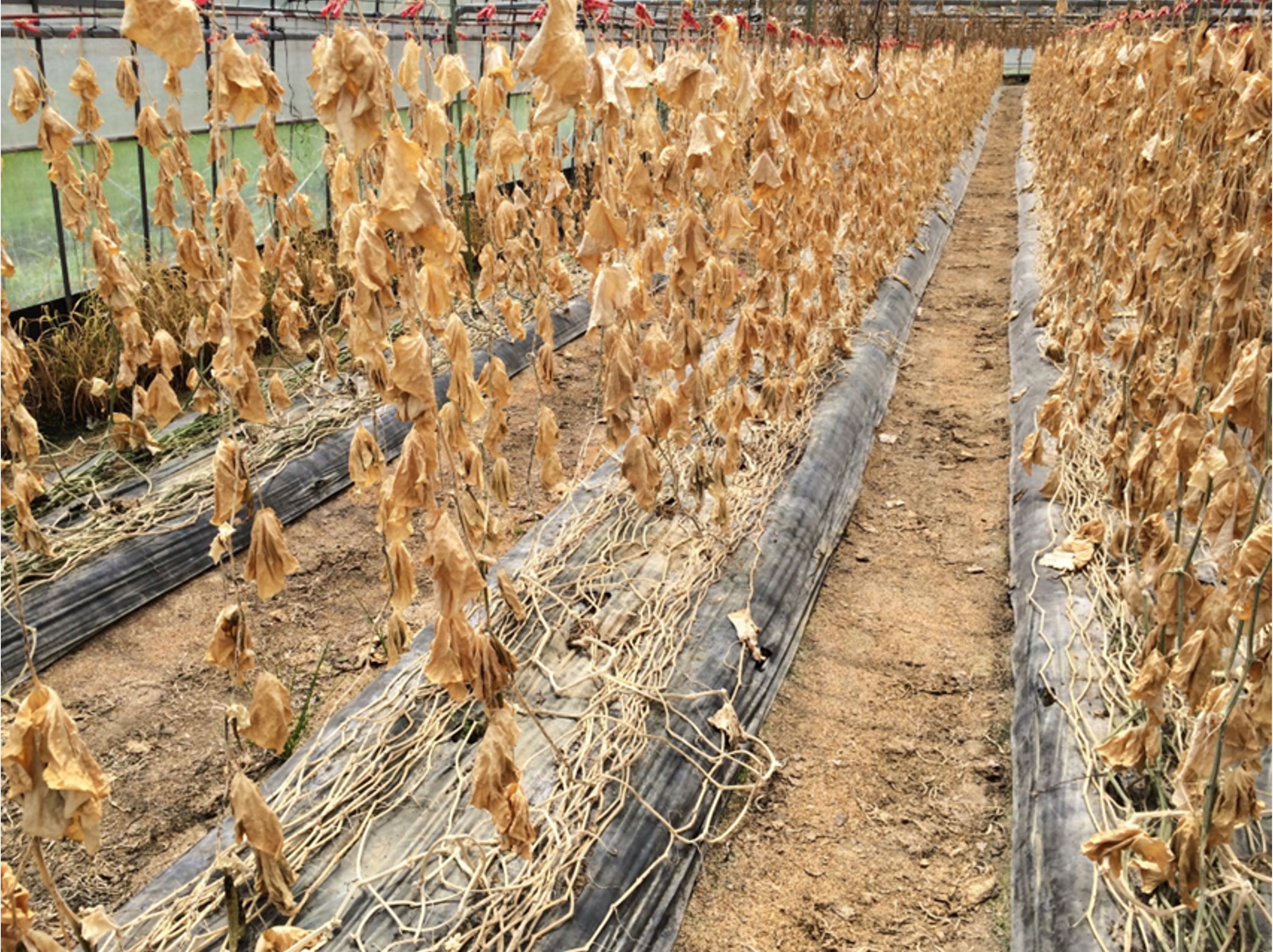 薬剤を使う代表的な方法に、カーバムナトリウム塩(キルパー)を用いた「古株枯死」がある(2)。図1はキュウリの栽培終了時に処理したものである。栽培終了時に速やかに処理できれば、生のままの株より早く分解することができる。ただし、農薬登録が無い作物に対して本法は実施できないので、登録内容を確認してから使用する。