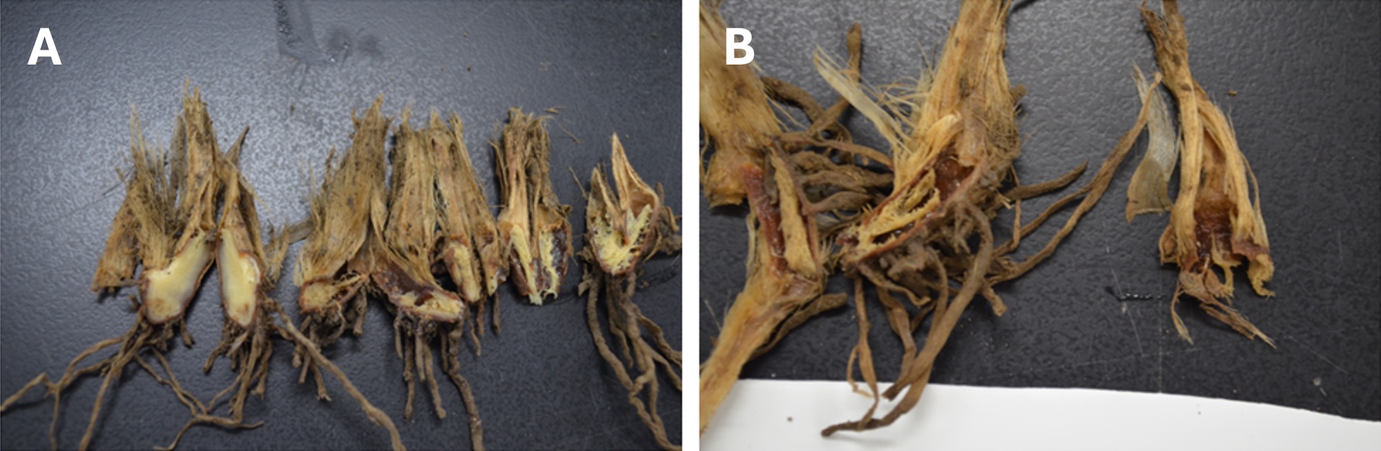 一方、微生物資材を使用すると、茎の太い部分は消失し、表皮だけになる。この状態であればネダニが隠れる部分は失われているので、薬剤が届きやすい。これは市販の微生物資材を用いた事例であるが、堆肥にも同様の残さ分解効果がある。ワラや籾殻などの植物有機物を材料とする堆肥には、残さを分解する微生物が豊富に含まれているためである。ただし、堆肥が入手できない場合や、堆肥の品質に不安がある場合などには市販の微生物資材を使うと良い。