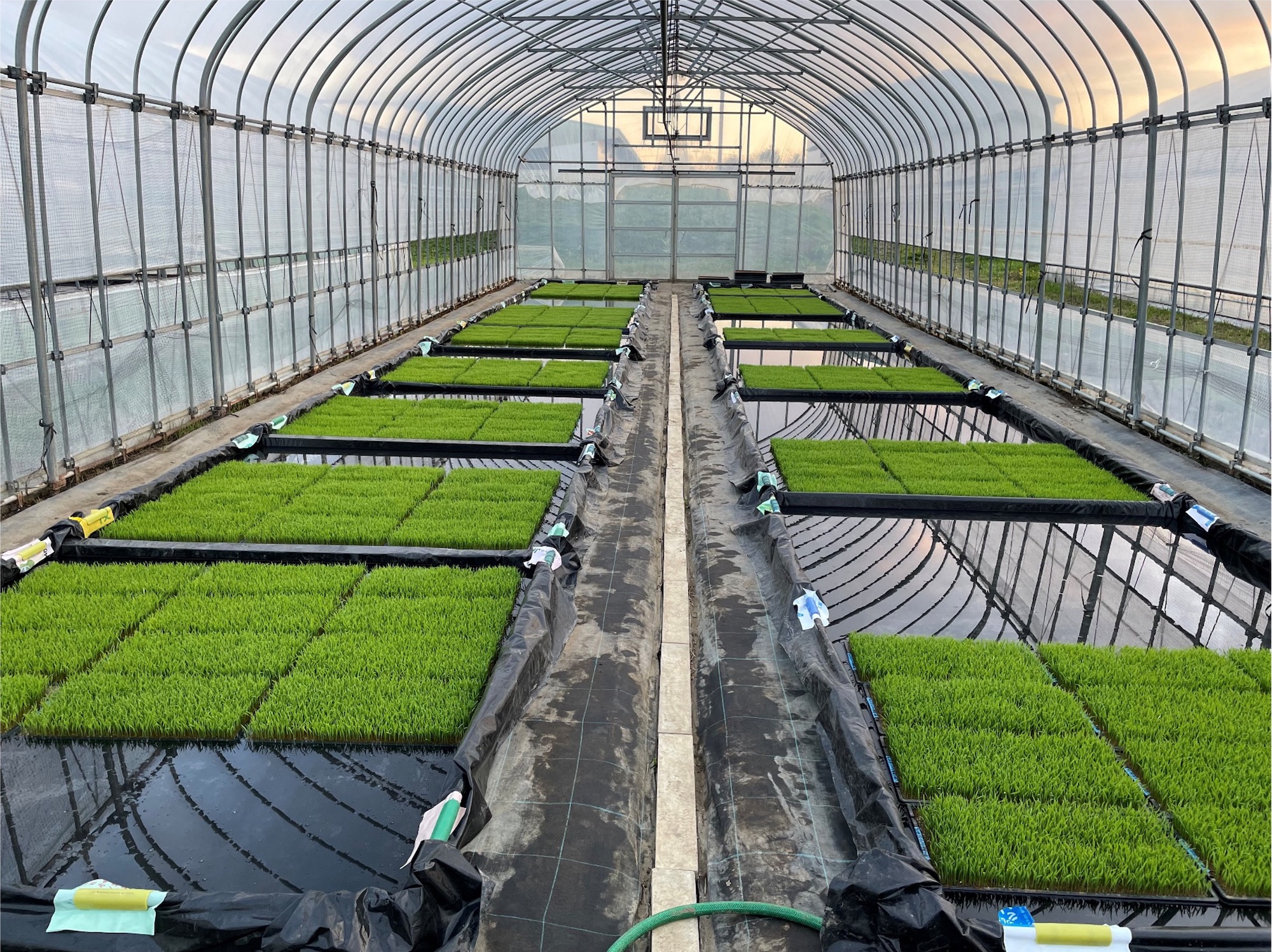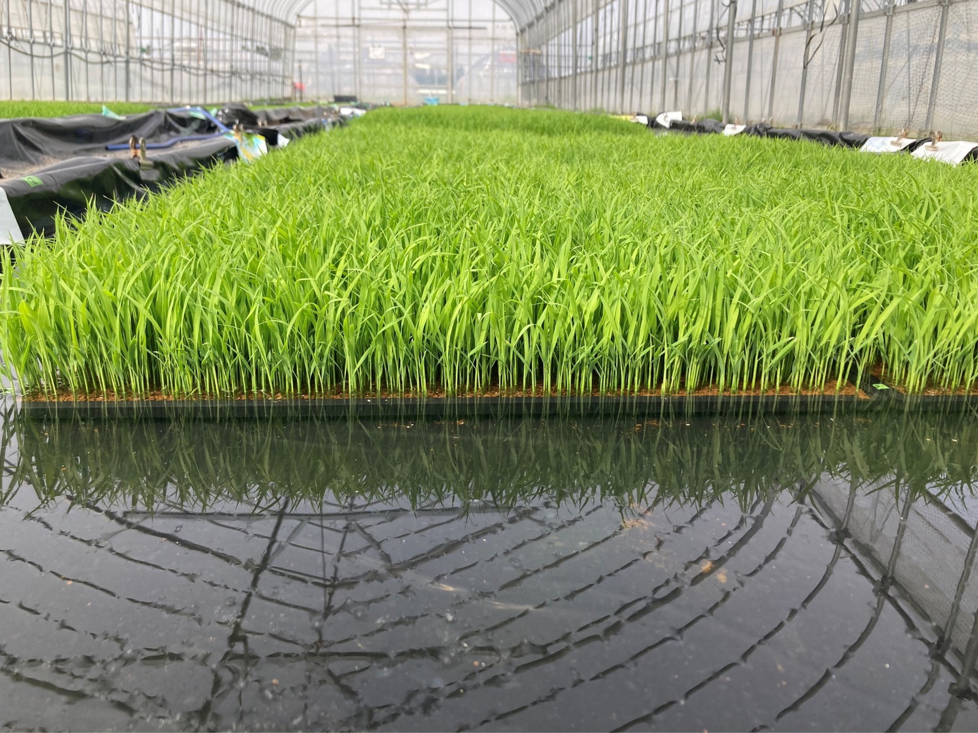 イネの育苗ハウスの中にビニールフィルムなどを敷いて簡易的なプールを作り、そこに育苗箱を並べて水を張り、苗を育てる方法をプール育苗という。以下のような利点がある。