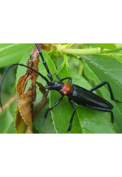 下:果樹や景観樹木に大きな被害をもたらしている侵入害虫「クビアカツヤカミキリ」の成虫。