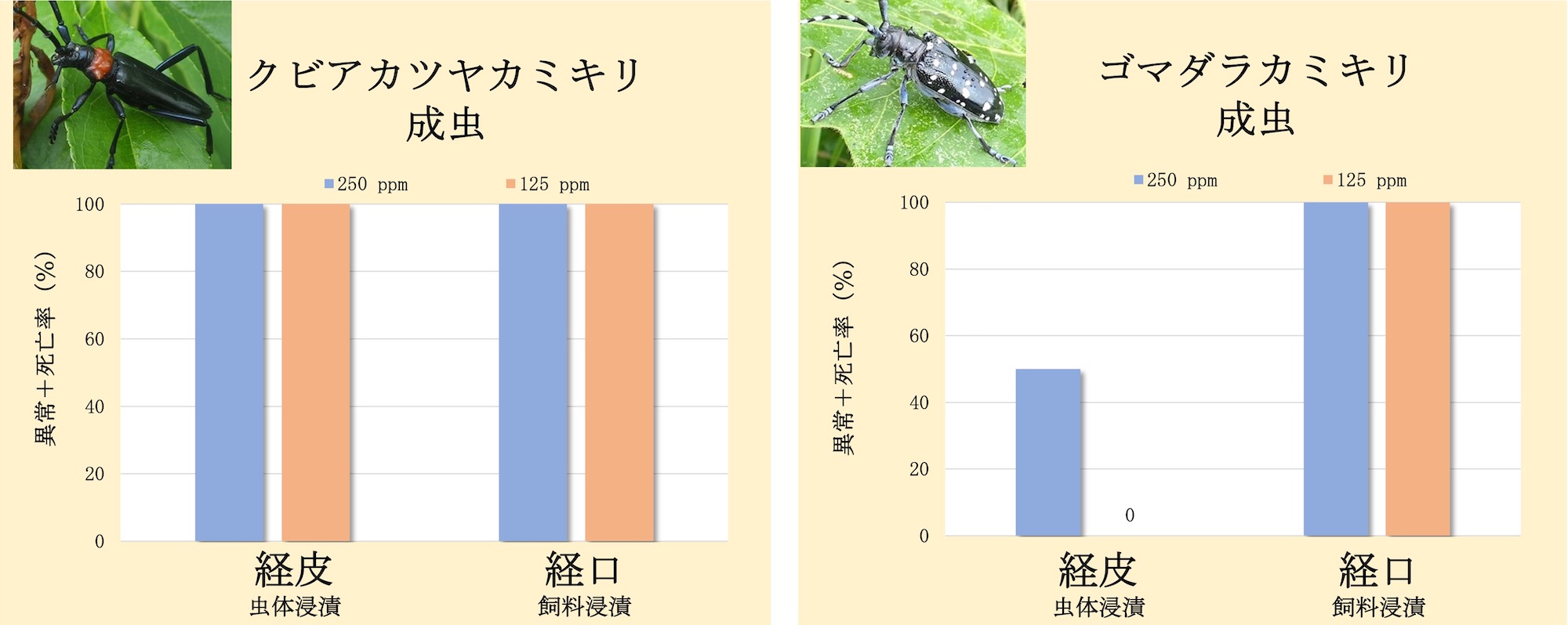 メタフルミゾン水和剤はカミキリムシ類全般に対する効果が高く、クビアカツヤカミキリ成虫に対しては、カンキツの害虫であるゴマダラカミキリよりも高い効果を示す。また、成虫に対し経皮(昆虫体表からの薬剤の取り込み)と経口(餌による口からの薬剤の取り込み)ともに効果が高く(図2)、処理1日後から翅を広げる特徴的な異常症状を示す(図3)。なお本剤は昆虫の神経伝達にのみ作用するため哺乳類への影響はない。
