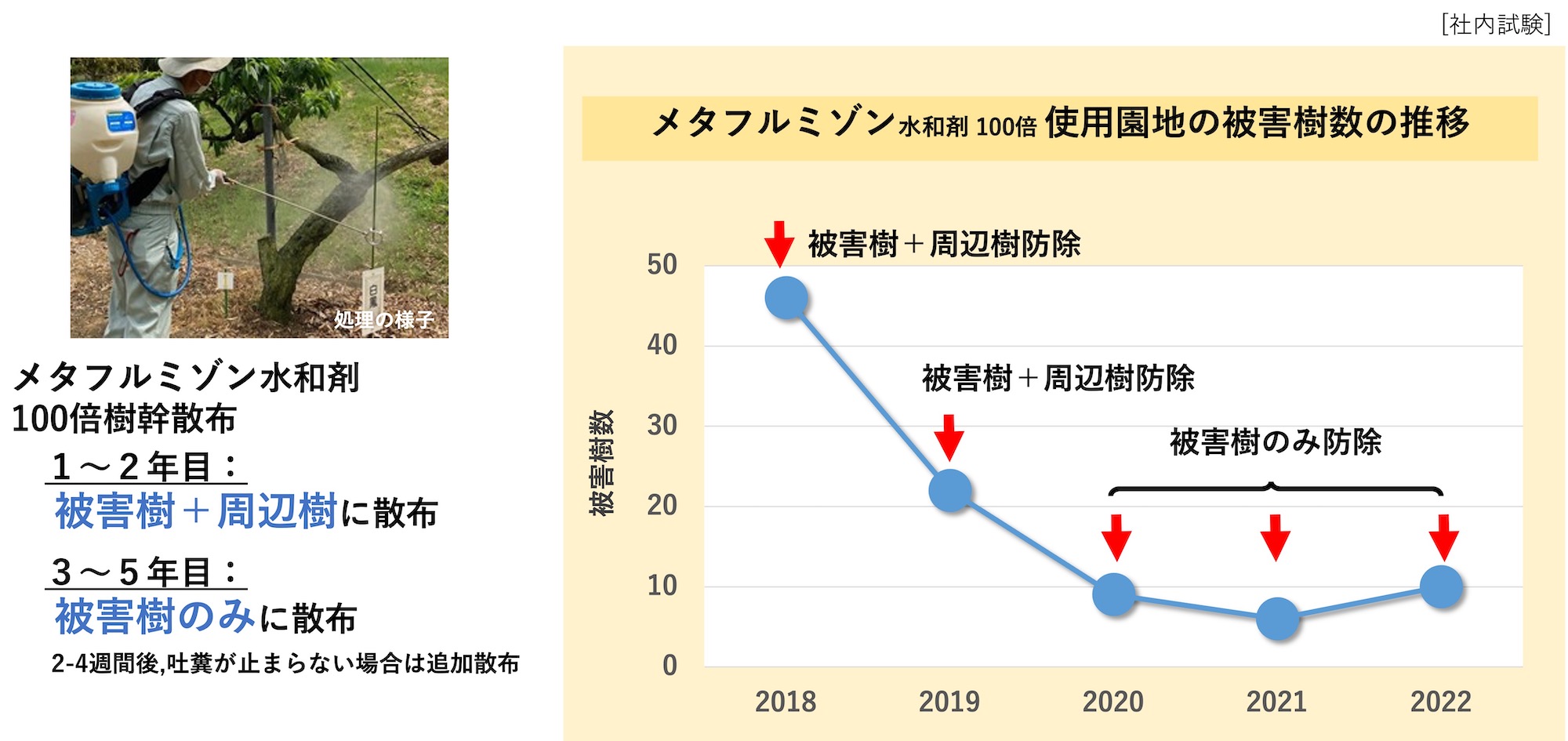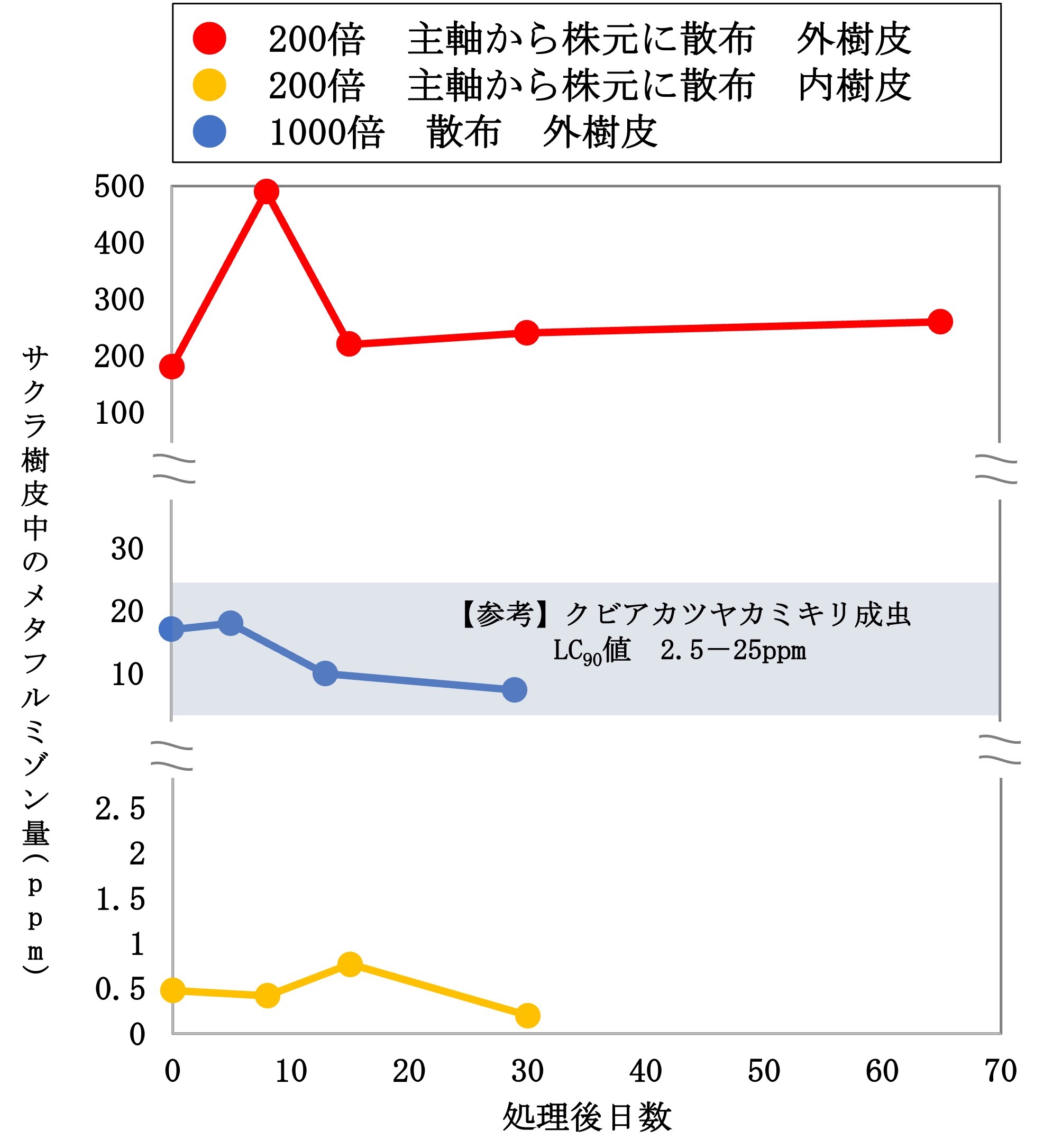 従って、クビアカツヤカミキリの幼虫が活動した際に、外樹皮付近に多く残る有効成分のメタフルミゾンを摂取することで防除効果が得られると考えられる。