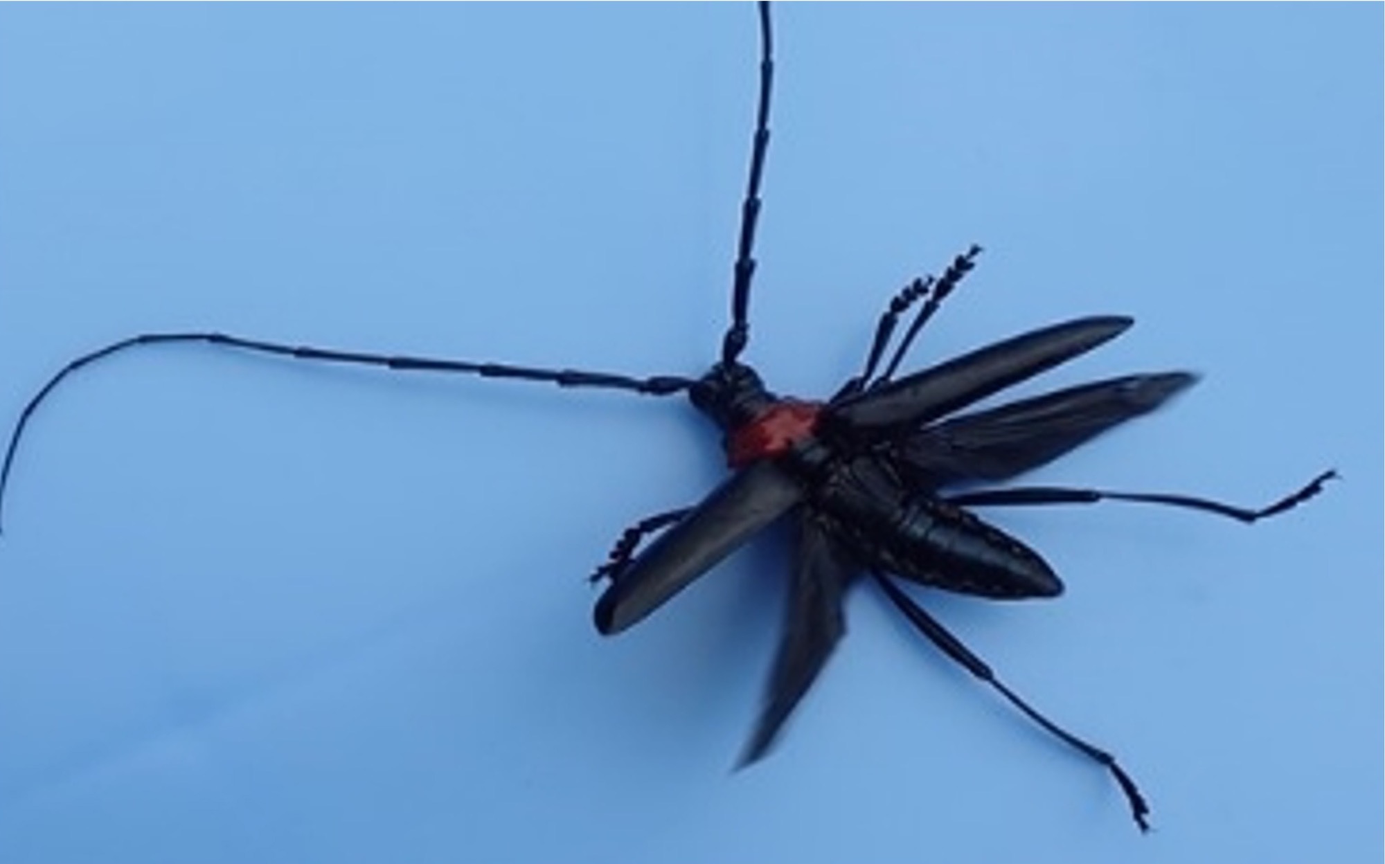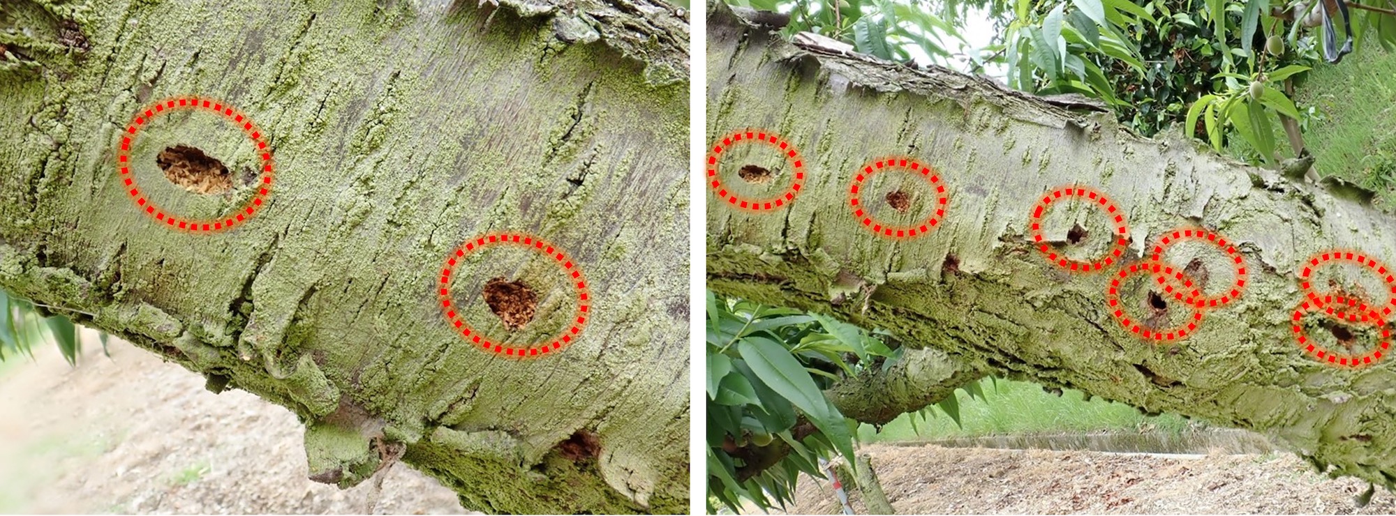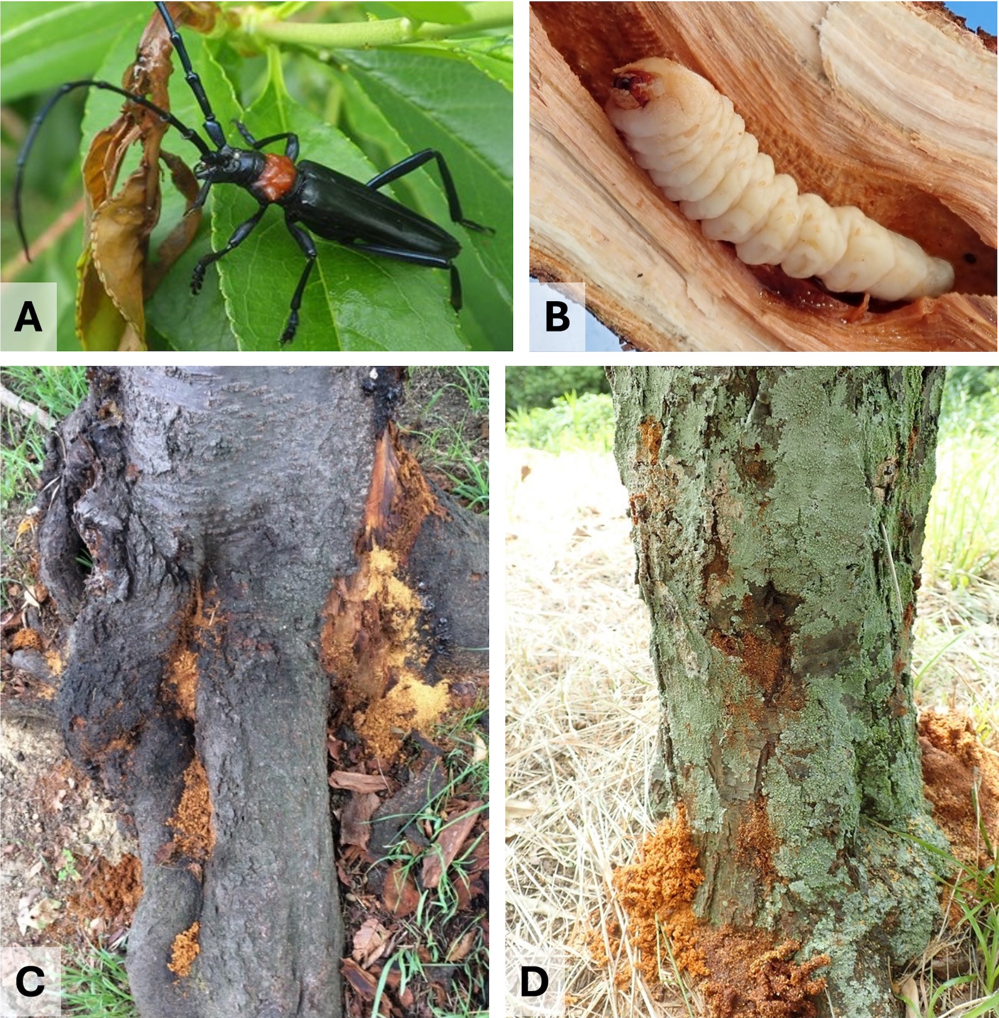 クビアカツヤカミキリ(Aromia bungii)は東アジア原産の侵入害虫で、2012年に初めて国内で確認され、現在は関東、東海、近畿、四国などに分布している(1, 2)。幼虫は樹木に侵入、食害し衰弱・枯死させるため、経済的被害だけでなく景観を損ねることから特定外来生物に指定されている。最初サクラで被害が確認されたが、現在はモモ、スモモ、ウメなど、いずれもバラ科樹木・果樹にも広がっている。6~8月に成虫が樹から飛翔して樹皮の隙間に産卵し、ふ化後、幼虫は樹皮下に侵入して長期間食害しながらフラス(糞と木屑の混合物)を排出する(3, 4)。幼虫は樹内部に生息するため初期被害に気付きにくく、薬剤が到達しにくいため薬剤防除は難しい。