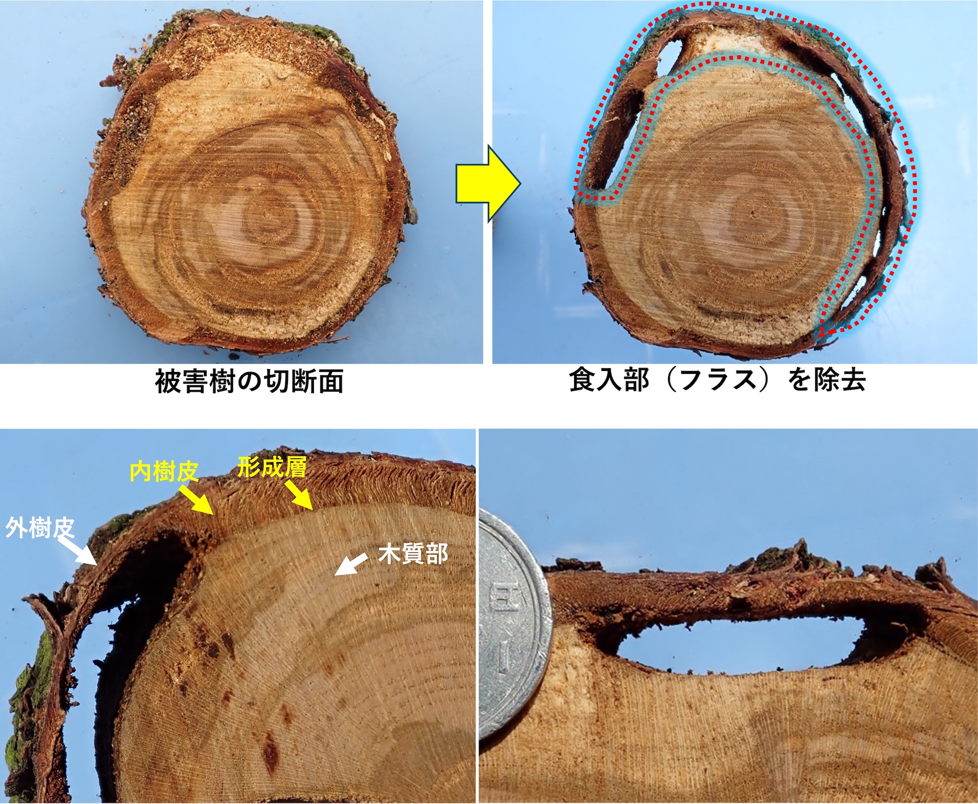 2. 幼虫の行動:幼虫は外樹皮に侵入した後も、フラスを排出する孔を形成するため、薬剤を含む樹皮上に顔を出す(図6)。