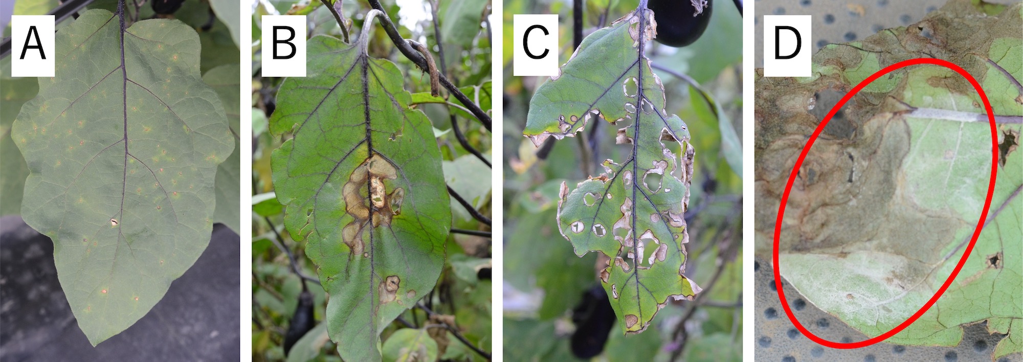 ナス果実の小陥没症がなぜ岩手県で問題化し、これまで他地域で発生報告がなかったのかは不明である。褐色斑点病自体は他地域でも発生しているため、気象条件など地域特有の環境要因があるのかもしれない。しかし、他産地でも生理的な障害として見過ごされているものの、実際には本症が発生している可能性も否定できない。したがって、葉に褐色斑点病(図2A~C)が見られる場合は、果実の小陥没症にも注意してほしい。