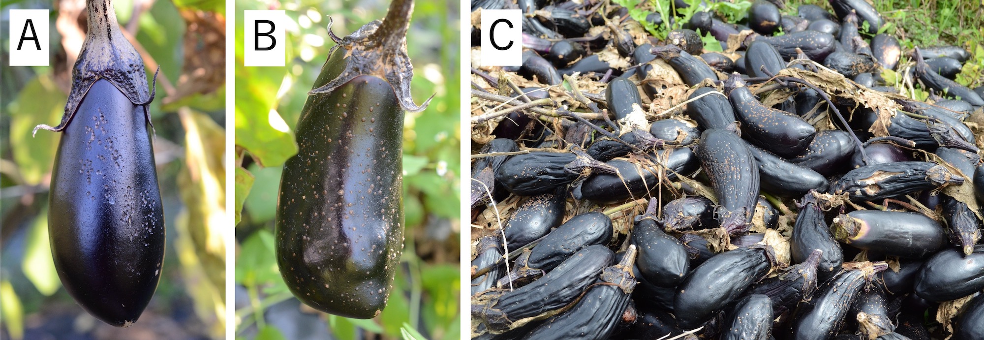 2008年頃から岩手県の露地栽培ナス産地で、実(以下「果実」)の表面に小さなくぼみが多数できる「果実の小陥没症」と呼ばれる障害が発生した(図1A)。この症状は当初、生産者の間で「ボツボツ」、「ブツブツ」と呼ばれていた。本症状が出た果実は外観品質が大きく低下し、出荷できなくなるため、生産者にとって深刻な問題である。多発した圃場では、収穫果実の約7割を廃棄した例もあり、被害は極めて大きい(図1C)。ここでは、小陥没症の発生状況や原因とともに防除対策について紹介する。