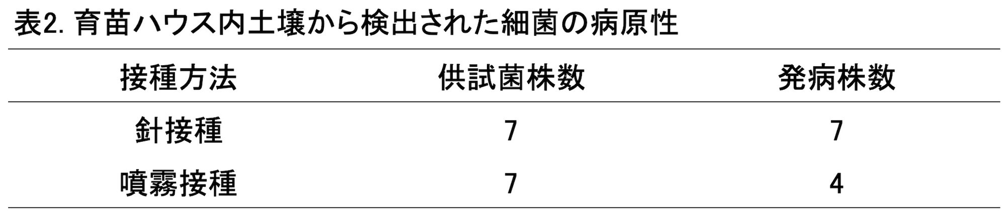 筆者らが井上氏のこれまでの防除対策を見直したところ、育苗ハウス内が未消毒であったため育苗中の感染が疑われた。そこで、育苗ハウスの土壌からかいよう病菌の検出を試みた。2005年3月、トマトの育苗が終わった育苗ハウス内の15地点において、各地点当たり5~6カ所の土壌を採取した。トマトかいよう病菌選択培地(2)を用いて、採取した土壌からバクテリアを検出した。その結果、15地点のうち中央通路の6地点と、育苗中に使用された歩み板に付着した土壌の計7地点からバクテリアが検出された。特に歩み板上の土壌からは10 2cfu/g・乾土※5のバクテリアが検出された(表1)。検出した7菌株※6を本葉3~4葉期のトマト苗に針で接種したところ、すべての菌株で病徴が再現し、噴霧接種によっても4菌株で発病が確認された(表2)。接種苗の病徴は、本圃での発病株と同じで、発病部位から同一のバクテリアが再分離された。このことから、育苗ハウス内の汚染土壌が本病の伝染源であることが明らかになった。