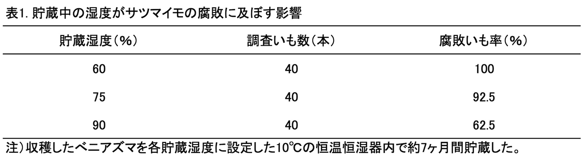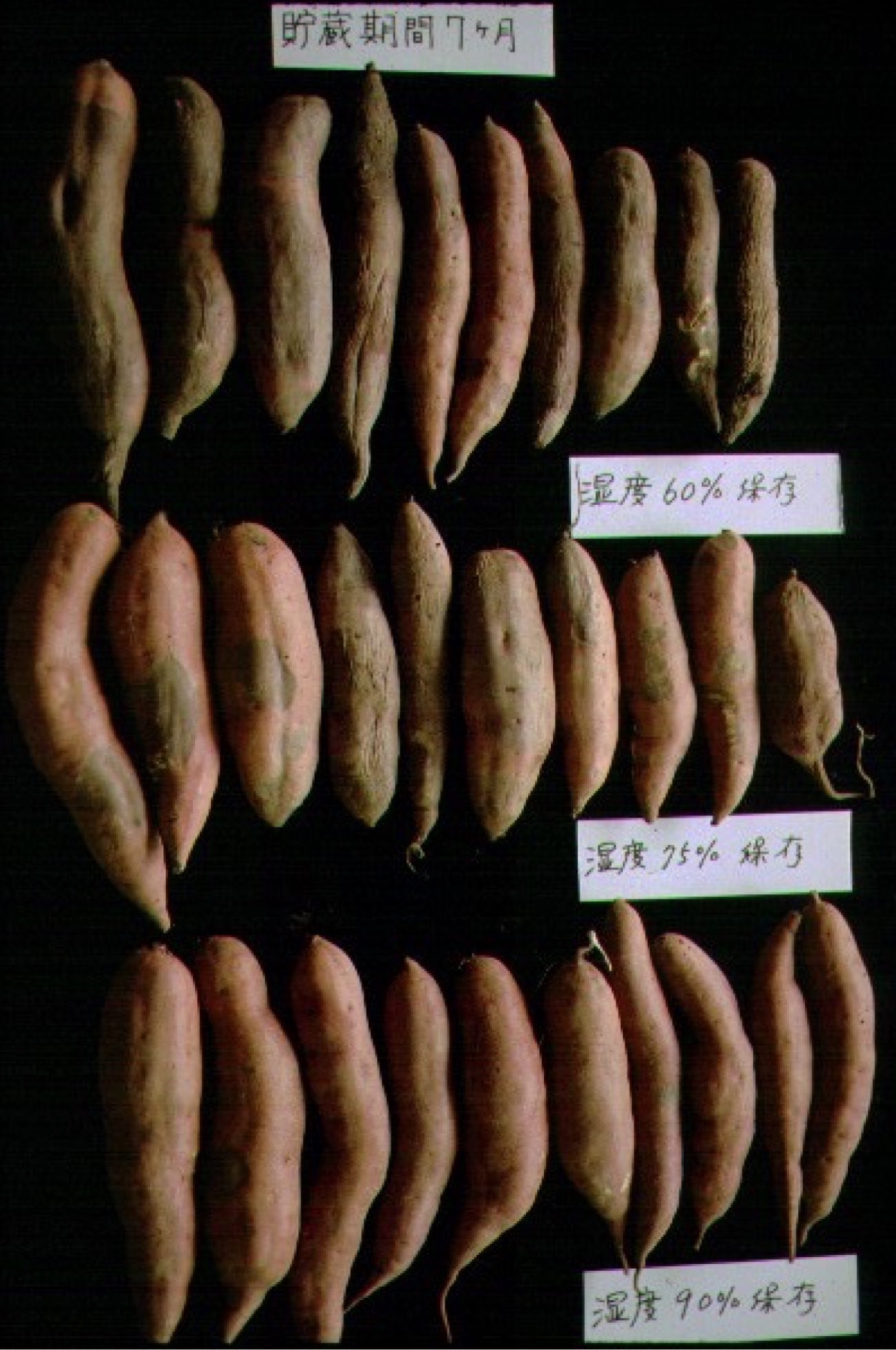 サツマイモは、機械等で収穫する際にいもの表面に無数の切り傷や打撲傷が生じる。この傷を修復させるため、キュアリング(4)を行い、貯蔵庫内で適切な温湿度条件下で貯蔵する。しかし、出荷調製時に機械でいもを洗浄して表面の土を洗い落とすため、再び多くの切り傷や打撲傷が生じ、さらにいもの両端を刃物で切断すると大きな切断傷が生じる。これらの傷から各種病原菌(カビ類)が侵入して腐らせることになる。腐敗を引き起こす病原菌は主に土壌中に生息しているが、大気中にも存在する。